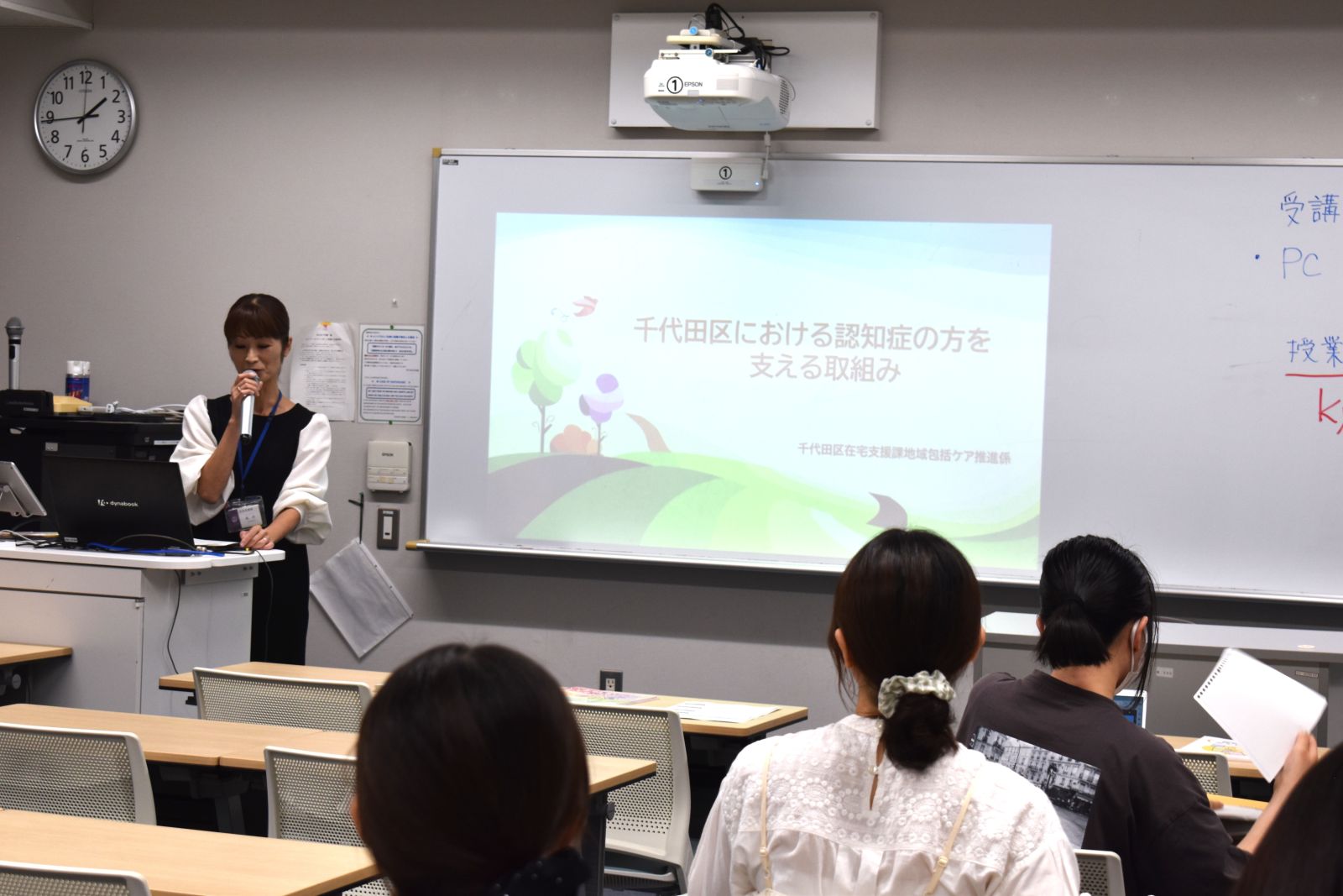 2025年 10 月 7 日、正課「サービス・ラーニング」では、千代田区在宅支援課の島田知子氏、保健師の鈴木裕子氏をお迎えし、認知症サポーター養成講座を開催しました。本科目は履修生全員が「認知症介助士」の資格を取得すると共に、高齢者に寄り添う環境づくりができることを目的に、千代田区認知症予防企画のひとつで ある「はあとカフェ」の企画・運営を行います。