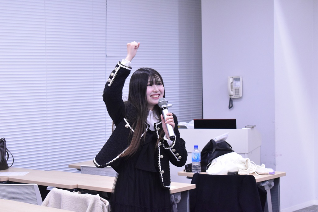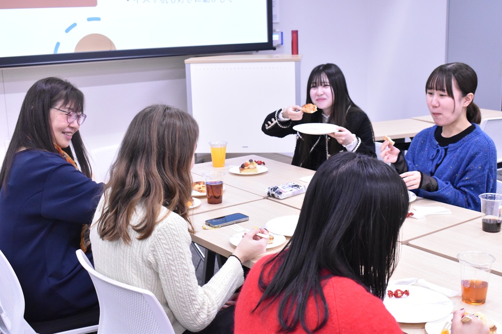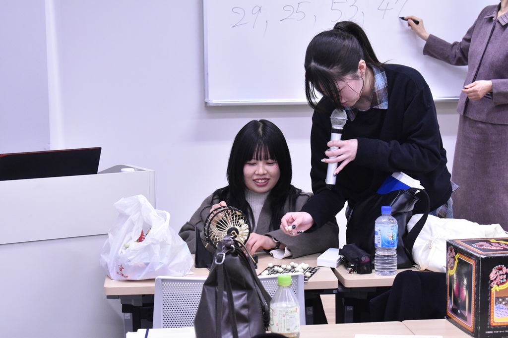 2025年12月17日にグローバル・コミュニケーションコースの「卒業研究(異文化理解)」の授業にて、秋に実施した交流授業で仲を深めた6名の留学生(フランス、中国、スイス)とのウィンターイベントを開催しました。当日の司会進行は、西村先生ゼミから選出された学生3名が行いました。それぞれ後期末の試験や課題に取り組みながら当日のプログラムの作成、景品、軽食の用意まで幹事として最後まで準備に励みました。当日行った3つのゲームのうち特に盛り上がったのは、ジェスチャーゲームでした。3つのチームに分かれ、それぞれのチームに渡された日本語のお題を出題者が確認し、残りのメンバーが日本語で回答するという留学生には少し難しい内容ではありましたが、直接言葉で伝えられなくてもボディランゲージなら相手にメッセージを伝えられるという異文化交流ならではのゲームになっており、苦戦しながらも正解した時には国境を超えた絆が生まれていました。最後はピザとケーキを食べながら仲良く談笑し、温かい時間を過ごしました。