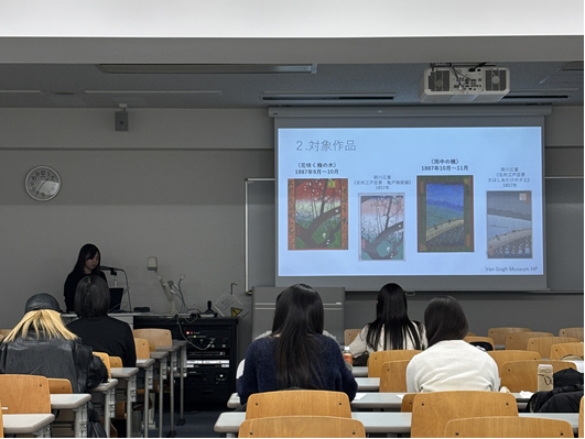 発表者それぞれが、これまで取り組んできた研究成果を堂々と発表し、活発な質疑応答も行われました。今回の発表会には、美術史専修以外の先生、美術史専修の3年次生、芸術領域の2年次生、美術史専修への進学を検討している1年次生など、たくさんの方にご来場いただきました。発表を聞いた下級生にとっても、来年度以降の卒業論文執筆に向けた貴重な学びの機会になったと思います。