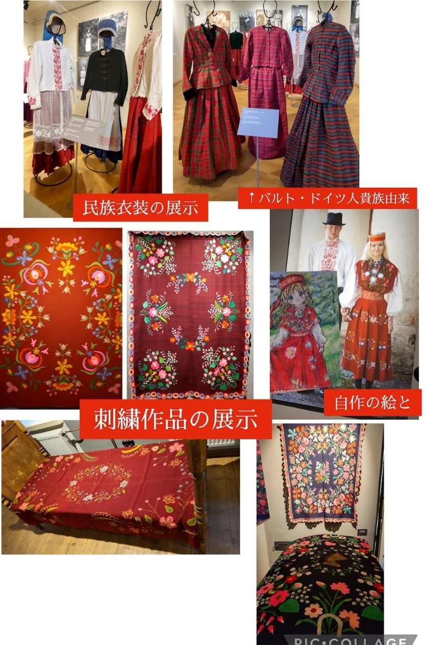 博物館内では、リフラ地方に古くから伝わる民族衣装や、かつてこの地に住んでいた、バルト・ドイツ人(=バルト海沿岸出身のドイツ人)貴族と、農民として暮らしていたエストニア人とのつながりについての説明パネル、刺繍のタペストリーが何枚も展示されていた。博物館の職員の話によると、バルト・ドイツ人貴族が荘園でエストニア人らを支配していた頃、彼らに仕えていたエストニア人の召使いたちはバルト・ドイツ人貴族女性が着ていたドレスを、安上がりに作れる生地で模倣したのが、この地の民族衣装が生まれる契機という。下部に掲載したチェック柄の衣装はまさにそうである。