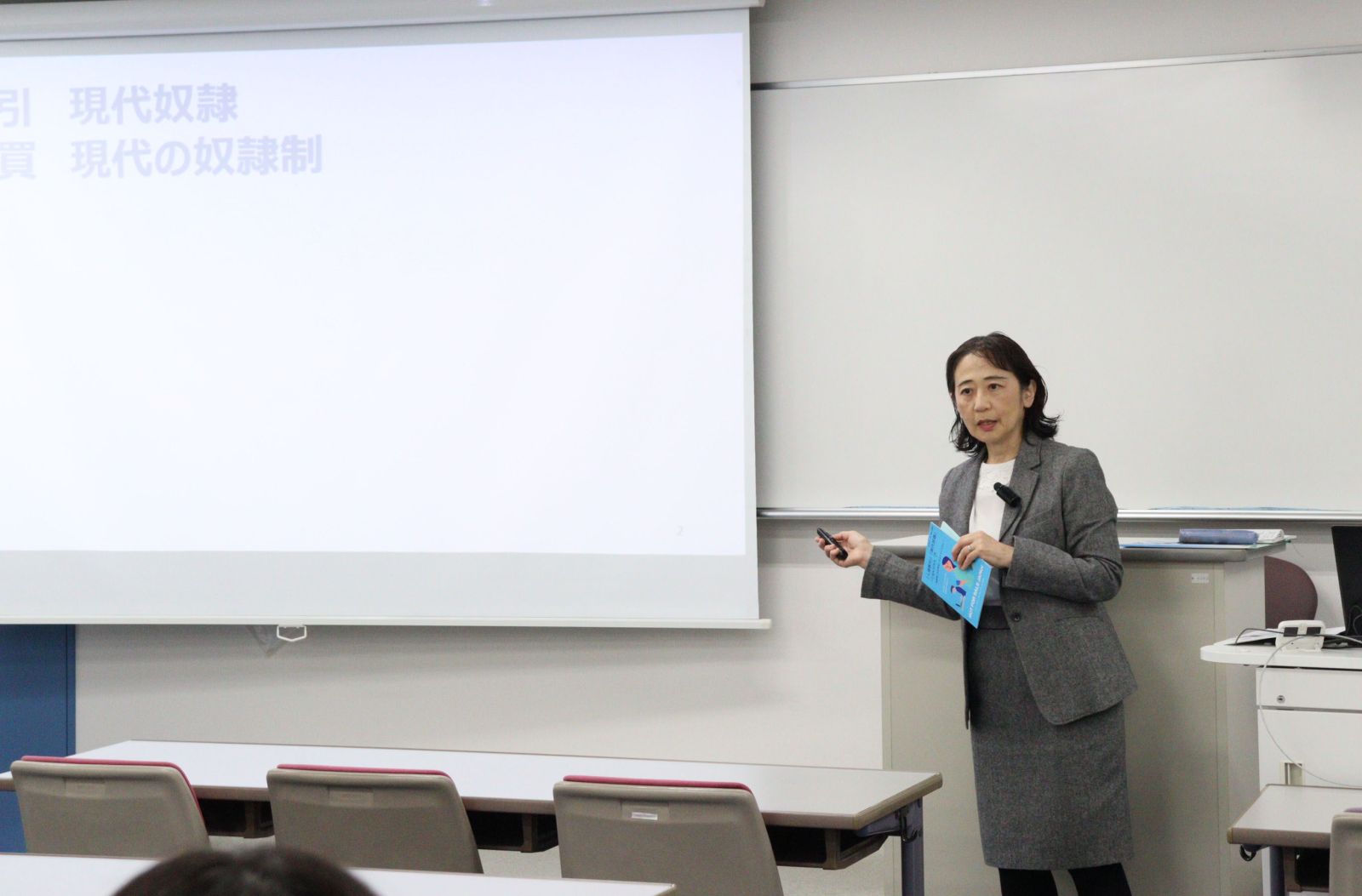 【国際学部】ノット・フォー・セール・ジャパン(NFSJ)の代表である山岡万里子氏をお招きして、国際人権論の講義が行われました。