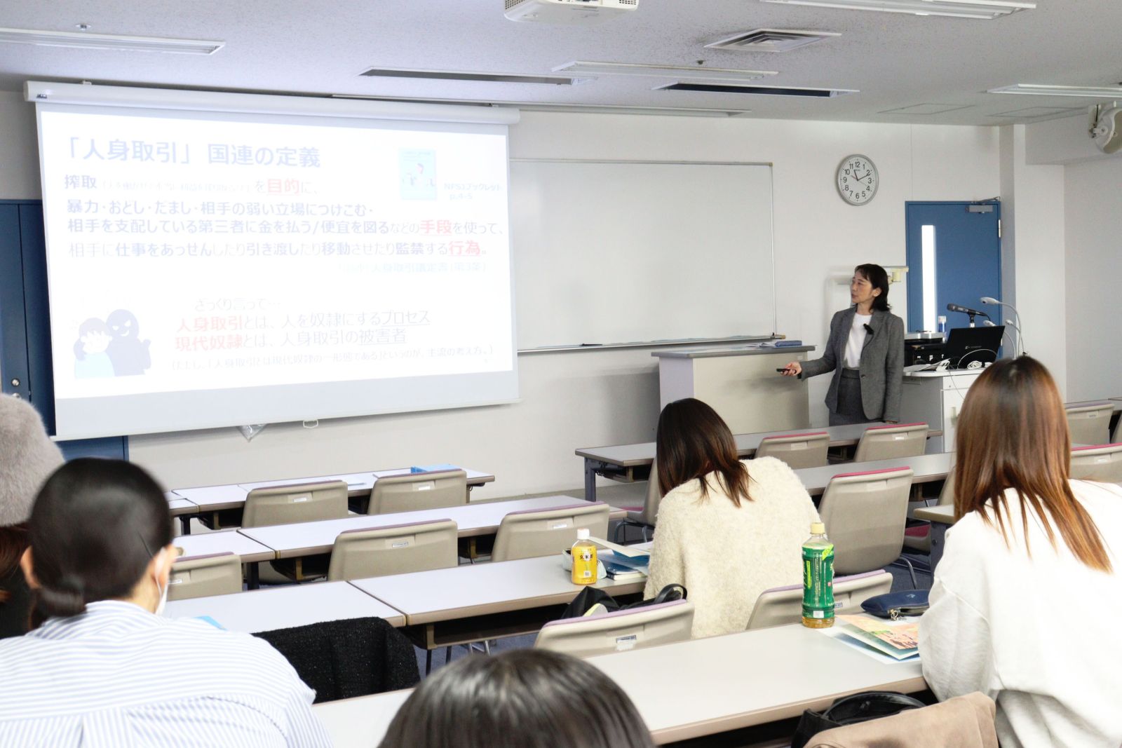 2025年10月30日にノット・フォー・セール・ジャパン(NFSJ)の代表である山岡万里子さんに国際人権論の講義にお運びいただき、「「人身取引」「現代奴隷」ってなんだろう?~被害者にも加害者にもならないために~」という論題でお話しいただきました。奴隷と聞くと、既に何百年も前に廃止されたと考える方も多いと思われますが、現実は異なります。今でも世界的に5千万人もの奴隷が存在するとのことです。