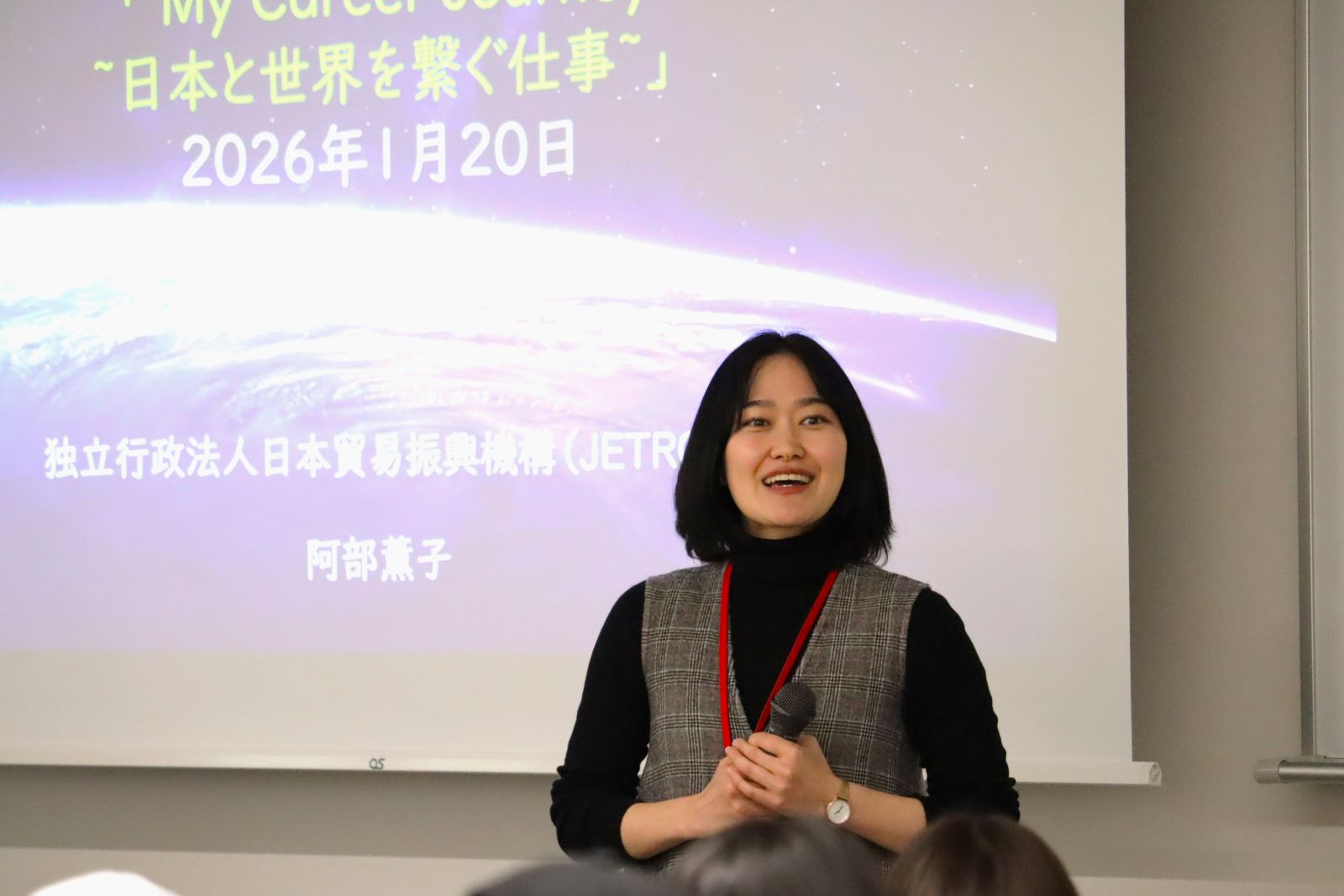 2026年1月20日(火)、「開発経済学B(3年次以上)」の一環で、独立行政法人日本貿易振興機構(JETRO)職員の阿部薫子さんをお迎えし、「My Career Journey~日本と世界を繋ぐ仕事~」と題して特別講義を実施しました。