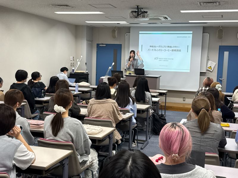 1回目の活動では、住商フーズ株式会社のご担当者をお招きし、「バードフレンドリー®コーヒー」の特徴や環境保全への取り組みについて講義していただきました。その後「バードフレンドリー®コーヒー」の試飲も行い、コーヒーを取り巻く環境と人とのつながりを学ぶ機会となりました。