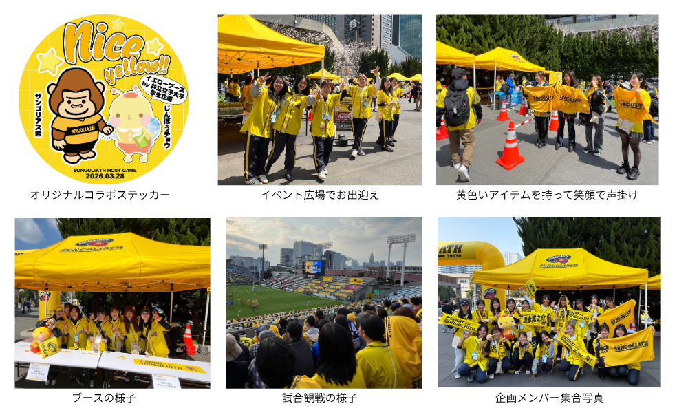 2026年3月28日(土)に秩父宮ラグビー場で開催された、NTTジャパンラグビーリーグワン2025-26 ディビジョン1 第13節「東京サントリーサンゴリアス」vs「埼玉パナソニックワイルドナイツ」とのホストゲームでは、学生が企画した黄色コーデで来場いただいた方にサンゴリアス君とじんぼうチョウのオリジナルコラボステッカーをプレゼントする「イエローブースby共立女子大学」を試合会場内イベント広場"ゴリらんど"に出展しました。