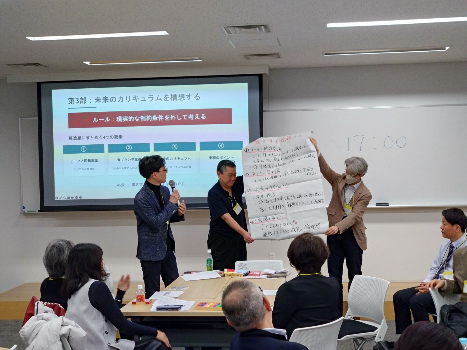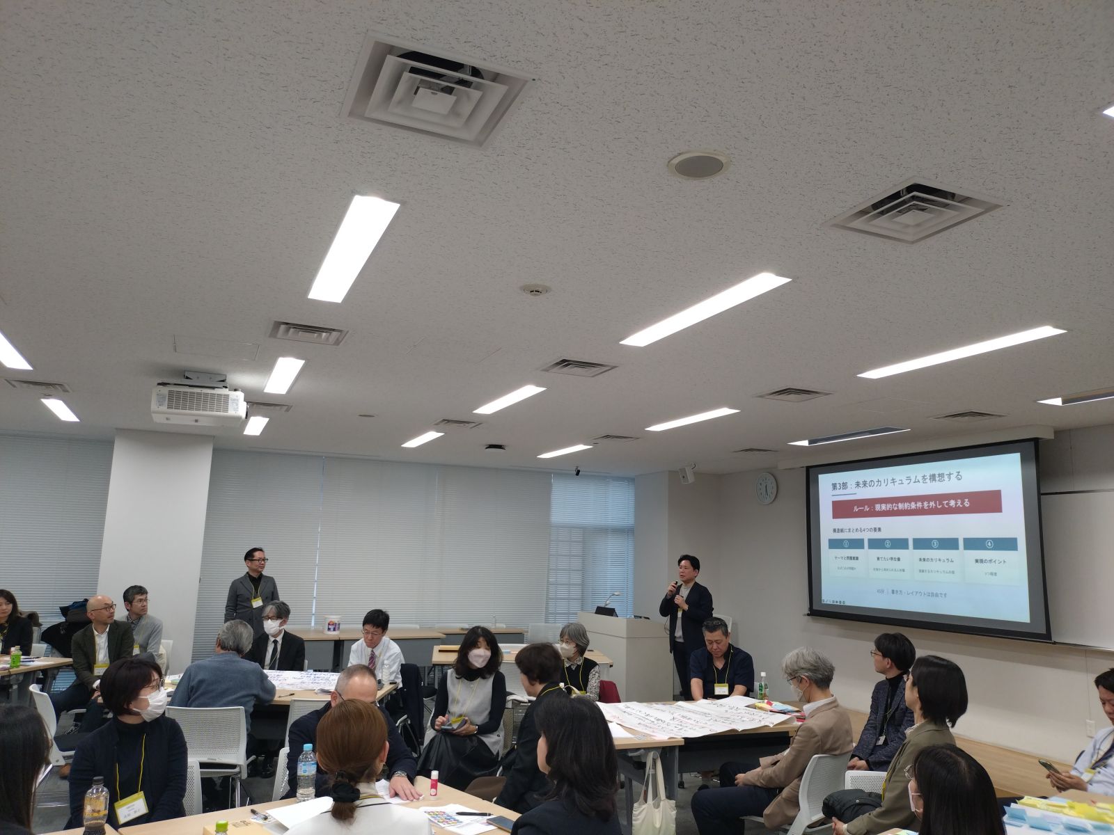 後半は、東京大学の佐藤浩章先生、北陸大学の山本啓一先生に、未来のカリキュラムを検討するうえで欠かせない、現在世界的にトレンドとなっている6つのキーワードを中心に講義をしていただきました。その後、興味・関心のあるテーマごとに分かれてグループワークを行い、参加者同士で課題感の共有や今後の目指すべき姿の検討を行いました。
