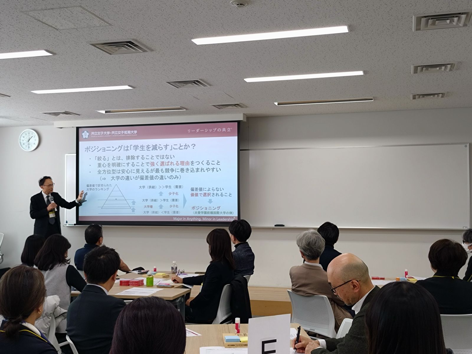 前半は、本学ビジネス学部の野沢誠治先生による「本学のポジショニングの再定義」ワークショップを行いました。マーケティングの視点から本学の立ち位置を全学的な視点で捉え直し、今後の方向性について参加者で議論しました。