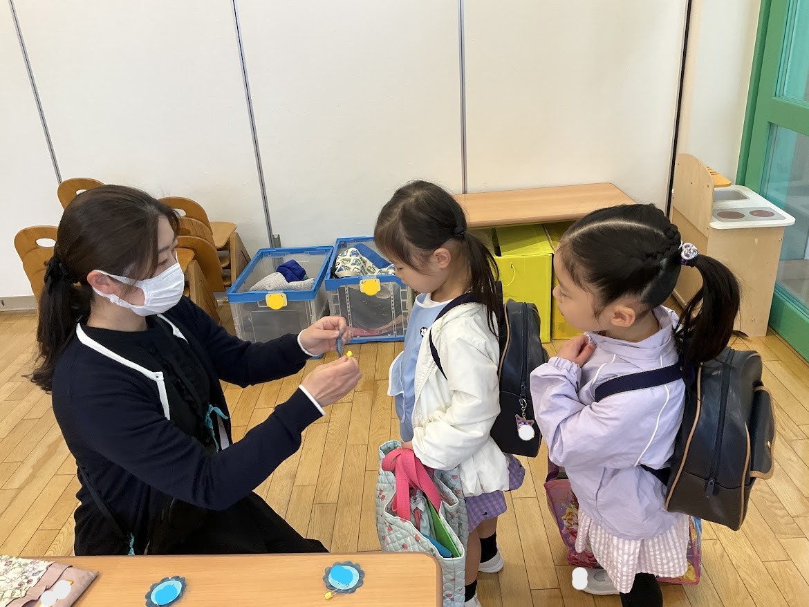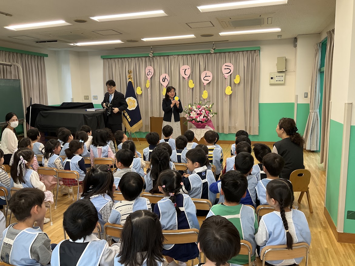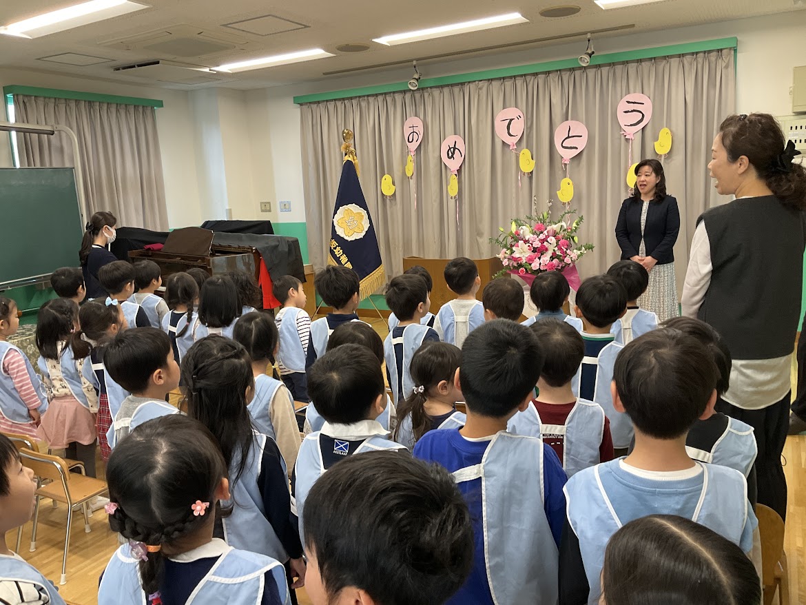 令和8年度、1学期の始業式をいたしました。いよいよ新しい年度が始まり、新しいクラスになったお子さん達は少し緊張しながらも、元気に登園する姿がありました。新しい保育室で、新しい名札を先生に付けてもらいました。ゆうぎ室では、園長先生のお話を聞き、先生たちのご紹介もあって、最後に「ようちえんのうた」を歌って、始業式を終えました。椅子にきちんと座って、お話を聞く姿がとても立派でした。